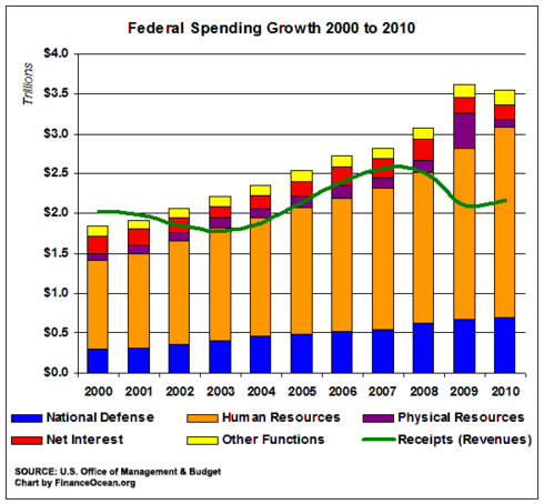 By 2010, however, the United States had a budget deficit of $1.3 trillion. The government had receipts of $2.16 trillion dollars (14.9% of GDP) and had outlays (expenses) of $3.46 trillion (23.8% of GDP).